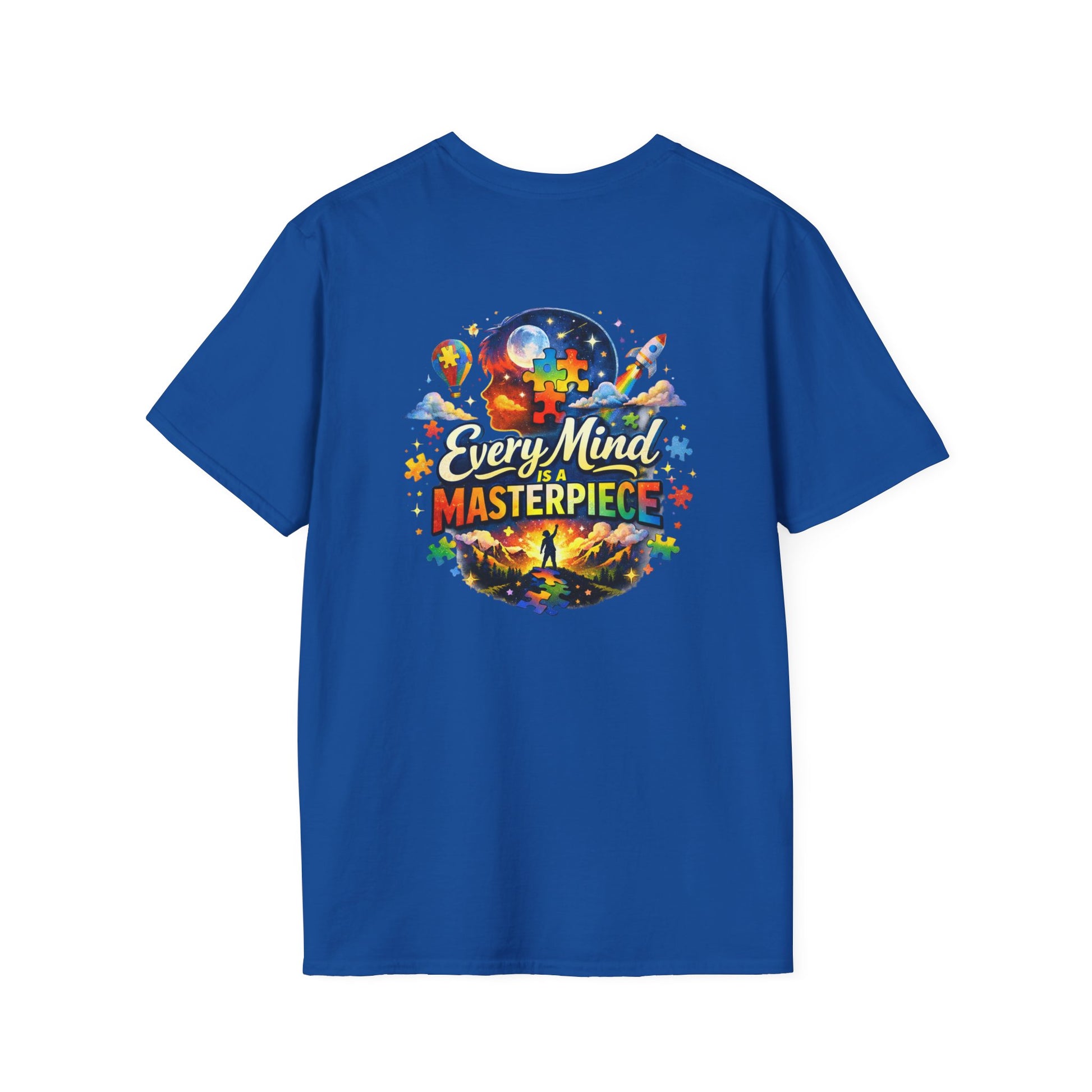 Soft, breathable tee featuring a warm, uplifting design that champions neurodiversity. The front shows a cheerful raccoon cradling a colorful puzzle-piece heart with the words “Every Piece Matters,” while the back carries a complementary scene and the line “Every Mind a Masterpiece.” Lightweight and smooth against the skin, this shirt carries a gentle, hopeful energy — the sort of piece someone wears to start conversations, show quiet solidarity, and bring color into ordinary days. It layers easily under a jacket for outreach events or stands alone at community walks and awareness gatherings, offering both comfort and a clear, compassionate message.